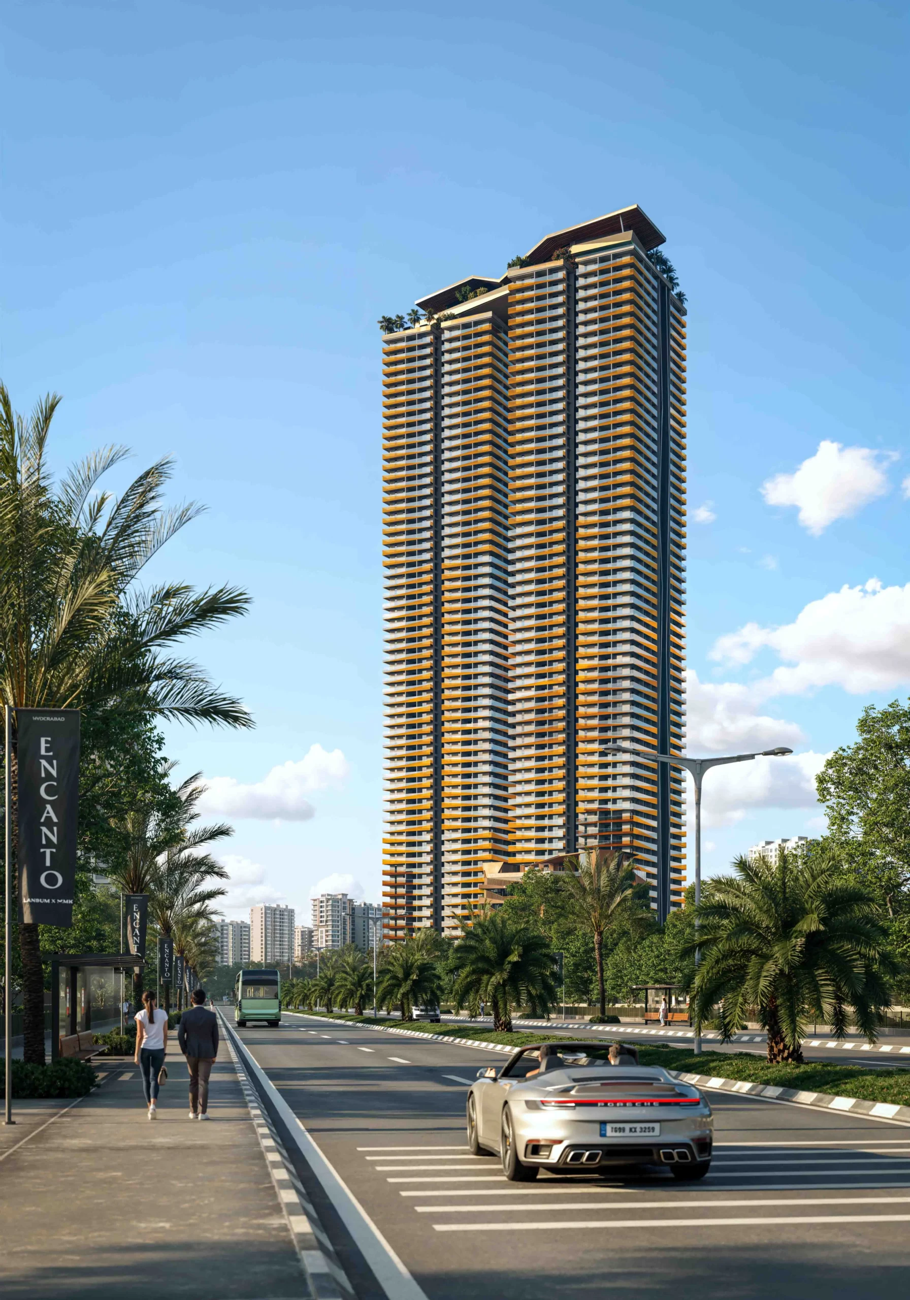 ENCANTO’s bold facade with premium finishes reflects refined living. Sharp lines and modern design make it a standout icon in West Hyderabad’s skyline.